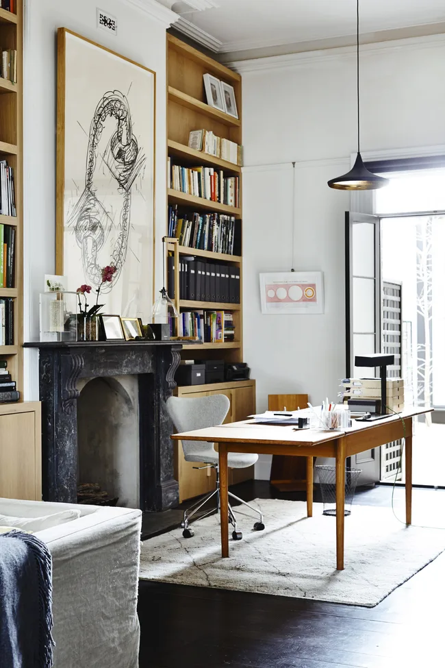 The dividing wall between the study and sitting area of this renovated Victorian terrace was removed to create one large, light and very peaceful room. Built-in cabinetry modernises the space and creates a library wall.