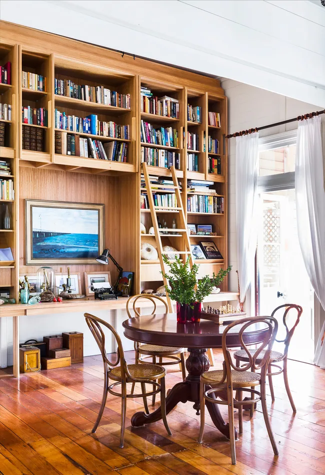 The library-style shelves contain all manner of books and antiques the family of this renovated Queenslander has collected over the years. The vintage table and Bentwood chairs are all eBay finds and the painting is by Greg Dwyer.