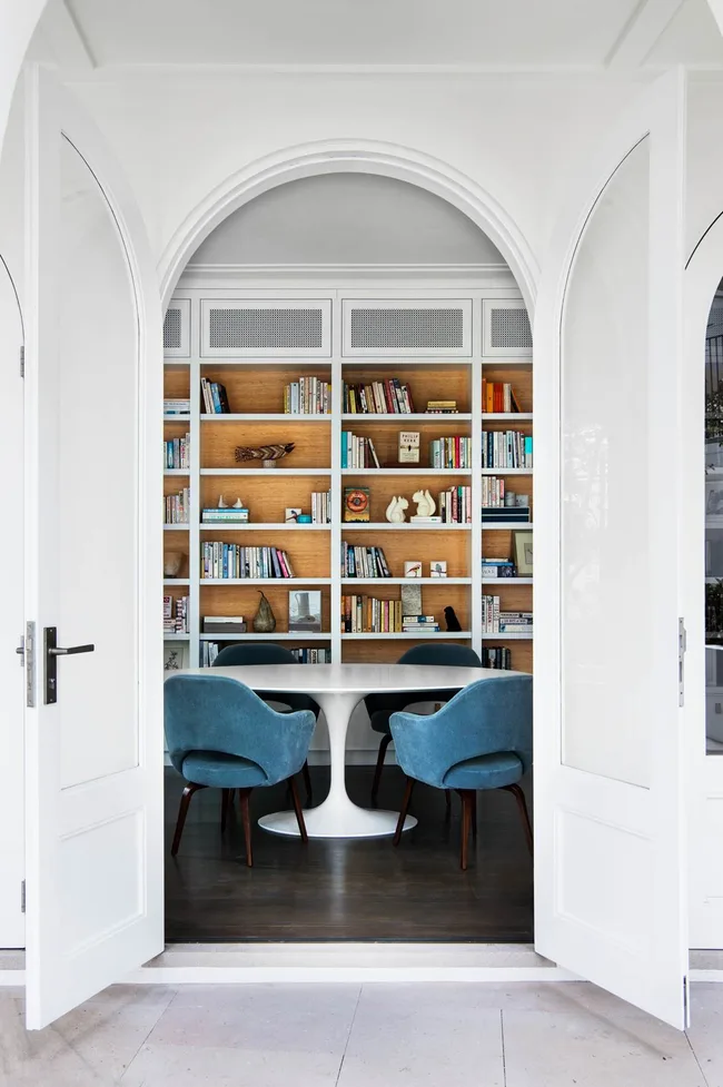 An elegant archway frames the ultra-luxe home library in this Mediterranean-inspired Sydney home. Seagrass wallpaper contrasts against the library’s white shelving while a Tulip-style dining table and curved dining chairs mirror the curves throughout the home.