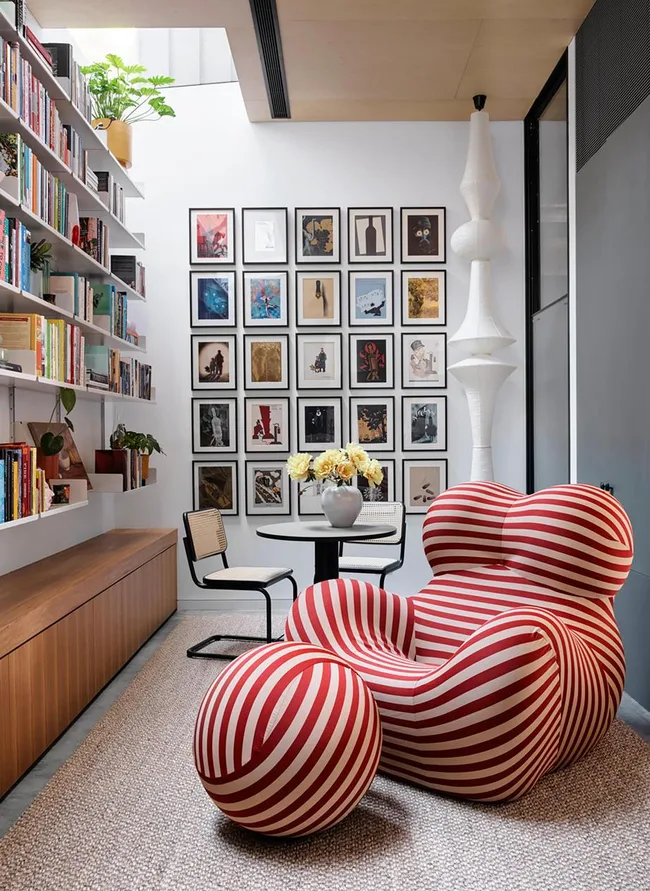 The vibrant library in this relaxed harbourside home is lined with Vitsœ bookshelves by Dieter Rams and the client’s collection of framed 1930s French wine posters. The iconic Up Series armchair by Gaetano Pesce serves as the focal point of the space.