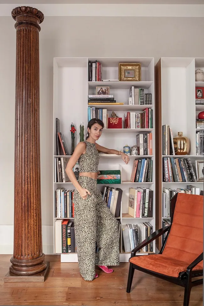 Homeowner, designer and textile consultant Marta Ferr stands in front of her contemporary library stacked with design tomes in her enchanting Milan apartment.