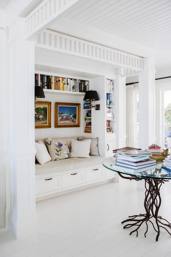The much-prized reading spot in this Hamptons-inspired holiday home in Perth is built into the library wall, encompassing the reader in a cosy nook.